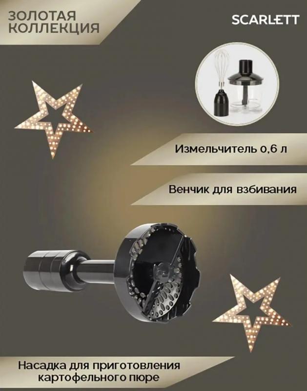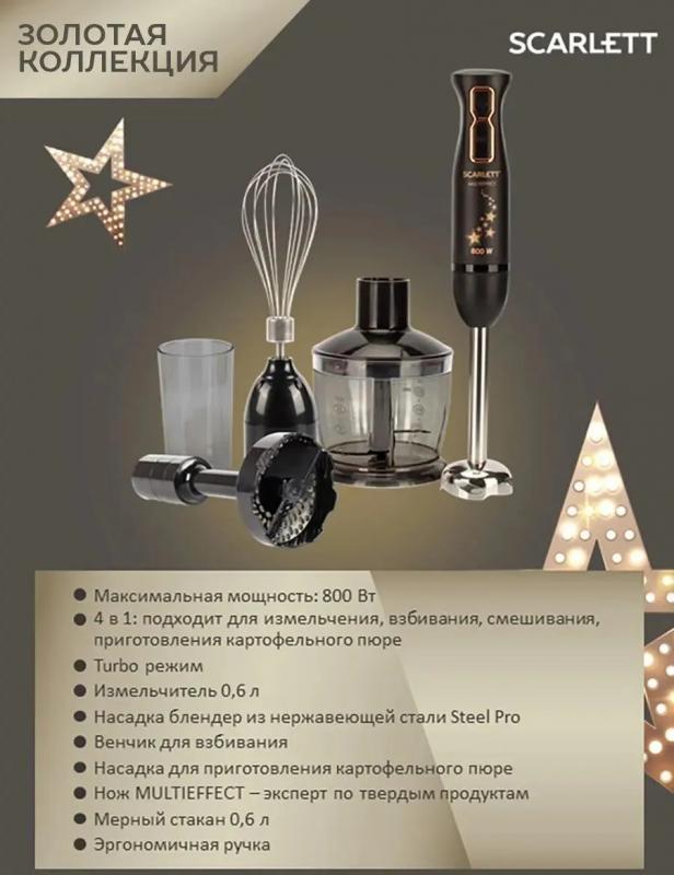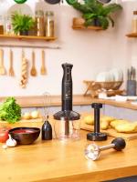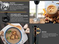 Погружной, мощность 800 Вт, погружная часть металл, корпус пластик, крепление на стену, измельчитель, мерный стакан, венчик для взбивания.