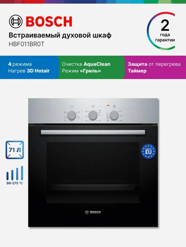 Духовой шкаф BOSCH HBF011BR0T электрический. Модель оснащена поворотными переключателями и механическим таймером. Мощность подключения составляет 2850 Вт, максимальная температура нагрева достигает 275 °С. Имеется гидролизная очистка и электрический гриль. Подсветка осуществляется одной галогенной лампой, дверца содержит два стекла. Полностью стеклянная внутренняя поверхность дверцы обеспечивает удобство ухода. Класс энергоэффективности A. Цвет нержавеющая сталь. Размеры 59.4х56.7х59.5 см вес 28.2 кг.