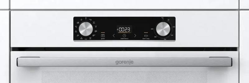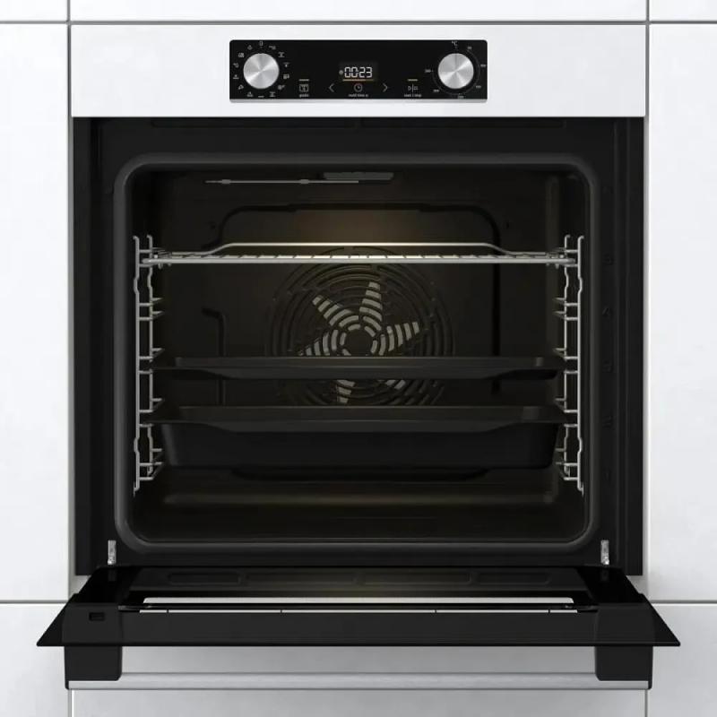 Электрическая духовка GORENJE BOS6737E03WG оснащена независимым управлением с утапливаемыми поворотными переключателями. Мощность подключения составляет 3500 Вт, класс энергоэффективности A. Объем камеры 77 литров с максимальной температурой нагрева 300 °С. Внутреннее покрытие выполнено из пиролитической эмали, предусмотрена очистка паром. Имеется конвекция и электрический гриль. Дисплей, часы и электронный таймер входят в комплектацию. Многофункциональная духовка содержит 12 программ работы. Присутствует вентилятор охлаждения, дверца открывается вниз, имеет полностью стеклянную внутреннюю поверхность и два стекла. Подсветка осуществляется одной лампой, есть звуковая индикация. Размеры изделия 59.5 х 56.4 х 59.5 см, размеры ниши для встраивания 56 x 55 x 59 см. Вес составляет 27.8 кг.