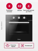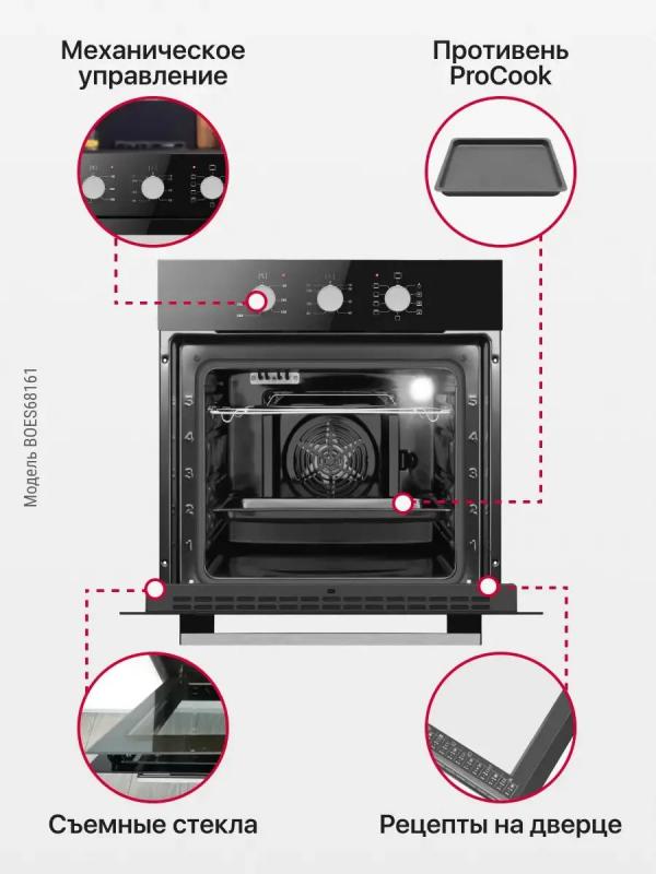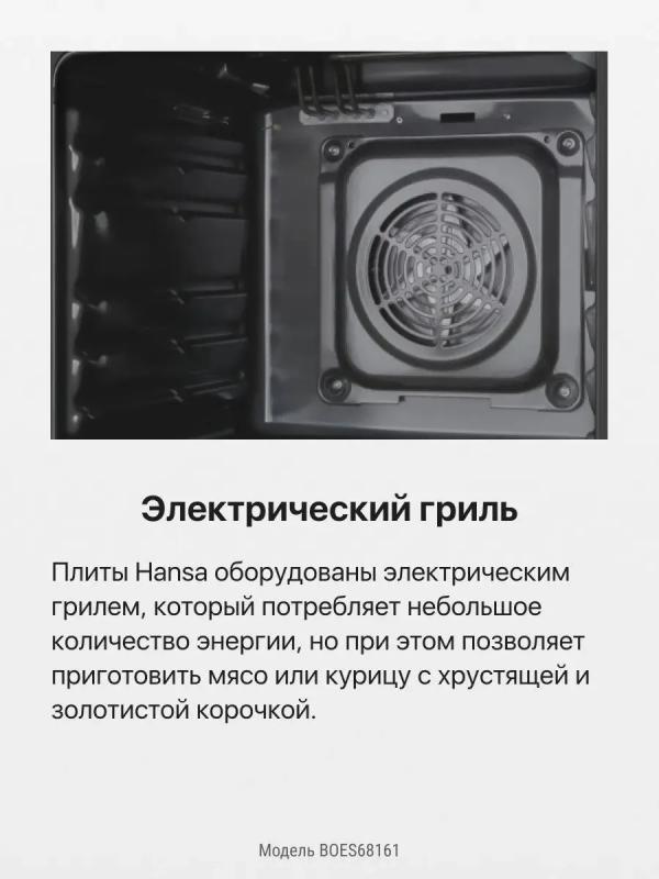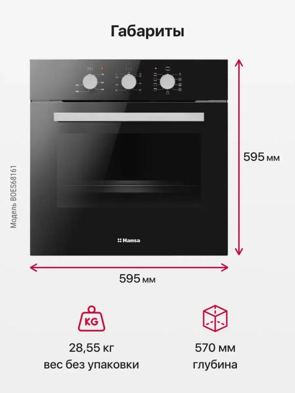 Электрическая духовка HANSA BOES68161 с независимым управлением оснащена поворотными переключателями и механическим таймером. Мощность подключения составляет 2900 Вт, объем камеры 62 литра. Духовка имеет класс энергоэффективности A и максимальную температуру нагрева 250 °С. Внутреннее покрытие выполнено из эмали легкой очистки. Устройство оборудовано конвекцией и электрическим грилем мощностью 2000 Вт. Предусмотрено 8 программ приготовления, включая быстрый разогрев, размораживание, турбо гриль и конвекцию. Дверца открывается вниз и содержит два стекла. Есть подсветка с одной лампой накаливания мощностью 25 Вт. В комплект входят плоский противень и решетка для жарки. На внутреннем стекле дверцы нанесены рецепты. Длина кабеля составляет 1.3 м. Размеры изделия 59.5 х 57.5 х 59.5 см, размеры ниши для встраивания 56 x 56 x 60 см.