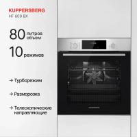 Духовой шкаф KUPPERSBERG HF 609 BX электрический. Мощность подключения составляет 3300 Вт, максимальная температура нагрева 255 °С. Оснащен электронным таймером, дисплеем и функцией отсрочки старта. Имеется гидролизная очистка и электрический гриль. Предусмотрено 10 программ приготовления с конвекцией. Дверца открывается вниз, оснащена двумя стеклами и доводчиком. Класс энергоэффективности А. Цвет черный с элементами из нержавеющей стали. Размеры 59.5х54.7х59.5см.