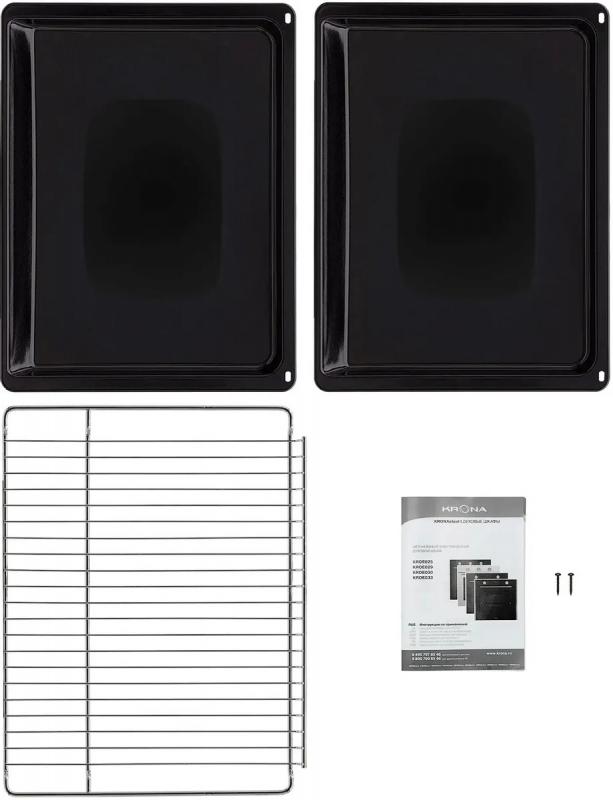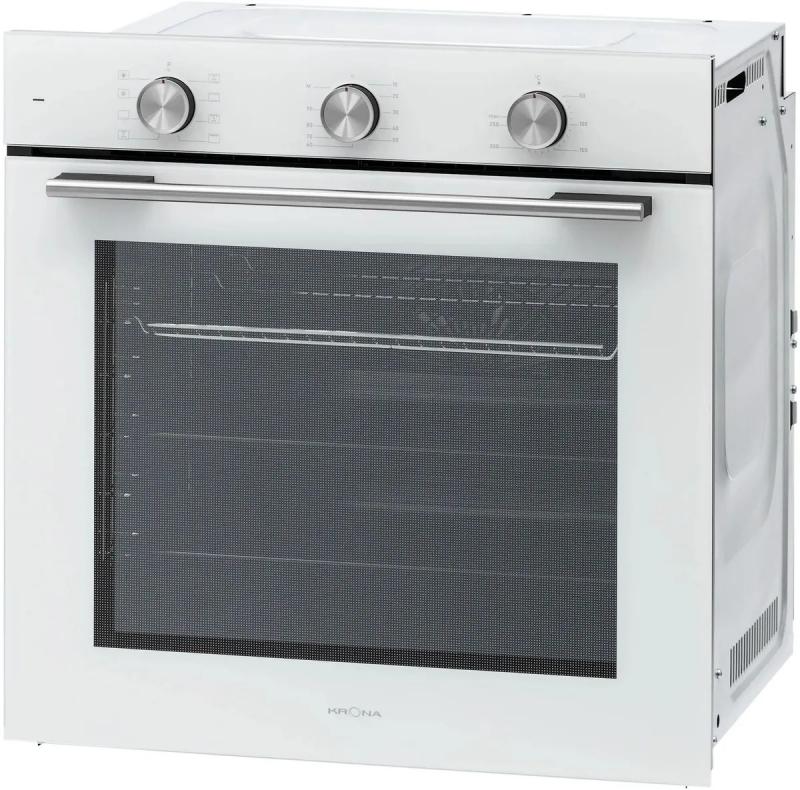 Электрическая духовка KRONA Birne 60 WH с независимым управлением оснащена поворотными утапливаемыми переключателями. Мощность подключения составляет 2475 Вт при классе энергоэффективности A. Объем камеры 78 литров с максимальной температурой нагрева 260 °C. Внутреннее покрытие выполнено из эмали легкой очистки. Имеется конвекция и электрический гриль мощностью 2450 Вт. Механический таймер входит в комплектацию. Духовка многофункциональная с семью программами работы: верхний и нижний нагрев, нагрев с конвекцией, нижний нагрев, гриль, гриль с конвекцией, малый гриль, освещение и размораживание. Дверца открывается вниз, имеет полностью стеклянную внутреннюю поверхность и состоит из двух стекол. Подсветка представлена одной лампой. Имеется защитное отключение. Подключение осуществляется кабелем без вилки. Размеры для встраивания составляют 56x55x60 см. Габариты прибора 59.5х56.7х59.5 см, вес 28.82 кг.