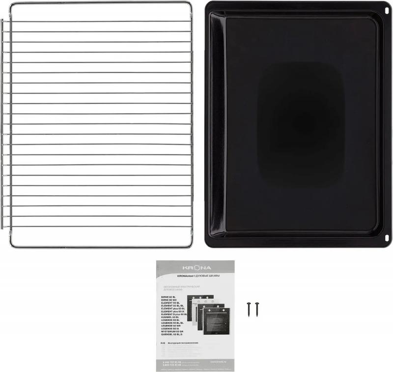 Электрическая духовка KRONA Element 60 BL/BL с независимым управлением оснащена поворотными утапливаемыми переключателями. Мощность подключения составляет 2331 Вт, класс энергоэффективности A. Объем камеры 78 литров, максимальная температура нагрева 260 °С. Внутреннее покрытие выполнено из эмали легкой очистки, предусмотрен традиционный способ мойки. Имеется электрический гриль и электромеханический таймер. Доступны режимы верхнего и нижнего нагрева, отдельно верхний и нижний нагрев, функция освещения. Дверца открывается вниз, имеет полностью стеклянную внутреннюю поверхность и два стекла. Подсветка представлена одной лампой накаливания мощностью 25 Вт. Присутствует защитное отключение. Подключение к сети осуществляется через кабель без вилки длиной 1.5 м. Размеры изделия 59.5 х 56.7 х 59.5 см, размеры ниши для встраивания 60 x 56 x 60 см.