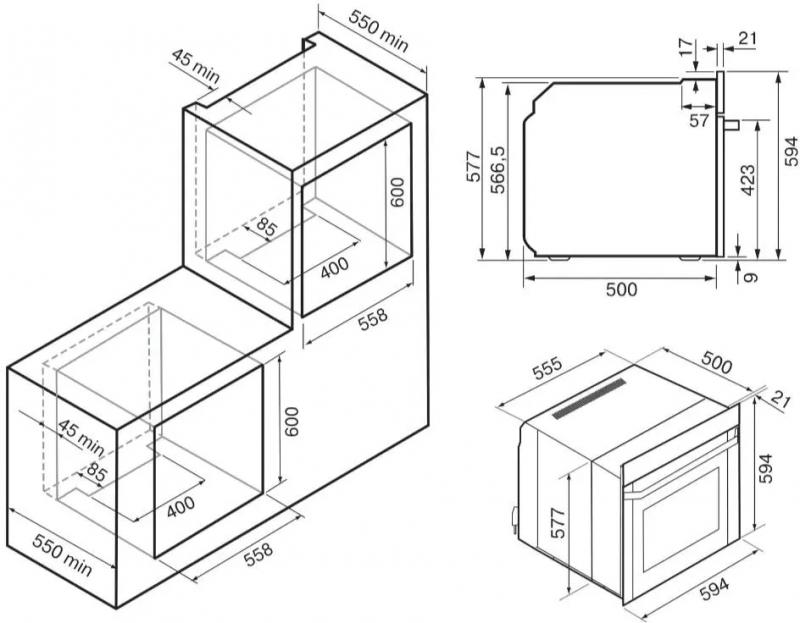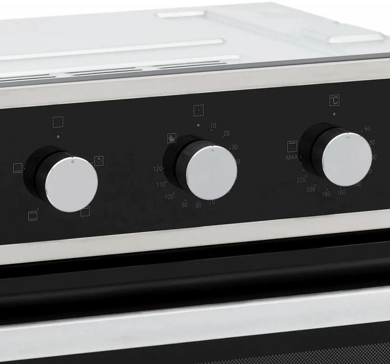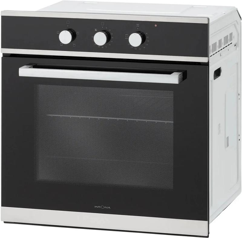Электрическая духовка KRONA Essenza 60 S G2 имеет независимое управление с поворотными переключателями и механический таймер. Объем камеры составляет 56 литров, максимальная температура нагрева достигает 260 °С. Внутреннее покрытие выполнено из эмали легкой очистки. Мощность подключения составляет 2500 Вт, класс энергоэффективности A. Духовка оснащена электрическим грилем мощностью 1300 Вт и тремя режимами работы: верхний и нижний нагрев, нижний нагрев, гриль. Имеется галогенная подсветка мощностью 25 Вт. Дверца открывается вниз и содержит три стекла, внутренняя поверхность полностью стеклянная. Подключение осуществляется кабелем без вилки. Размеры прибора составляют 59.4 х 52 х 59.4 см, размеры ниши для встраивания 55.8 x 55 x 60 см. Цвет корпуса - нержавеющая сталь/черный.