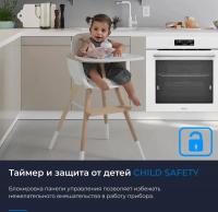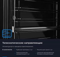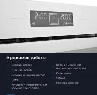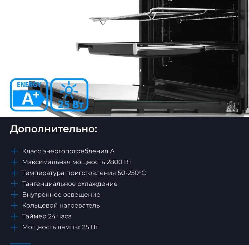 Электрическая духовка ZUGEL ZOE601W с независимым сенсорным управлением имеет класс энергоэффективности A. Объем 75 л и максимальная температура 250 °С. Внутреннее покрытие из эмали легкой очистки. Оснащена конвекцией, электрическим грилем мощностью 2800 Вт. Есть LED-дисплей, электронный таймер, часы, индикатор остаточного тепла и электронный программатор. Предусмотрено 9 программ приготовления. Термощуп в комплекте. Одноуровневые телескопические направляющие. Дверца открывается вниз, содержит три стекла. Галогенная подсветка мощностью 25 Вт. Имеет функции защиты от детей и автоматического отключения. Подключается кабелем с вилкой длиной 1 м. Размеры 57.5 х 59.5 х 59.5 см, вес 31.5 кг. Размеры ниши для встраивания 56.5 x 58.5 x 60 см.