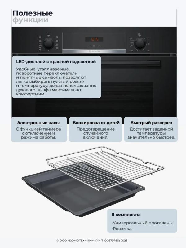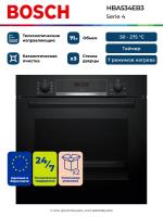 Электрический духовой шкаф Bosch Serie 4 HBA534EB3. Тип духового шкафа электрический. Мощность подключения составляет 3400 Вт а максимальная температура нагрева достигает 275 °C. Управление электронное с LED-дисплеем и функцией отложенного старта. Духовой шкаф оснащен 7 режимами работы включая гриль и конвекцию. Количество стекол дверцы - 3. Цвет черный. Класс энергоэффективности A+. Размеры 59.4x56.7x59.5см вес 32.9кг.