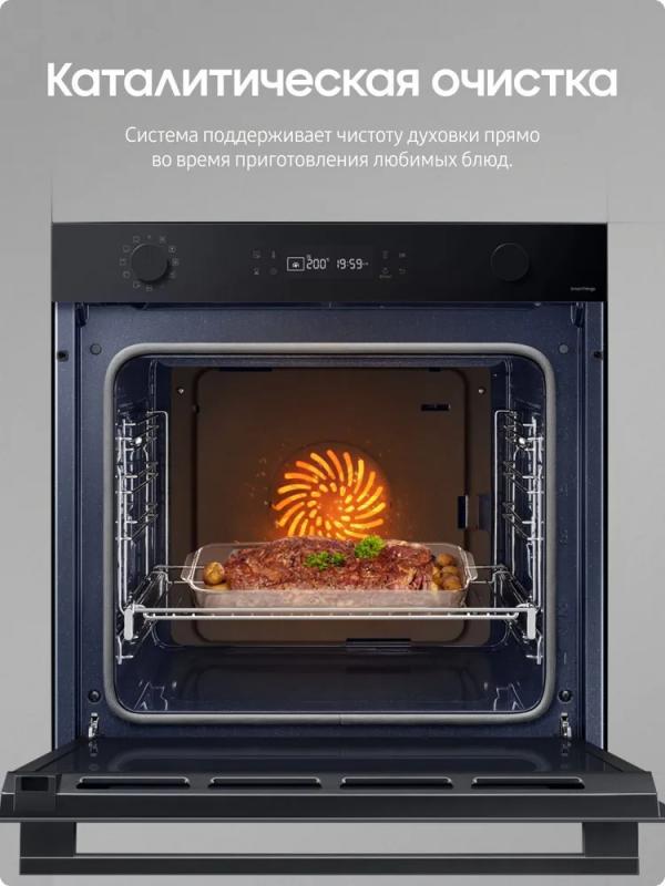 Электрический духовой шкаф Samsung NV7B41201AK/WT класса энергопотребления A+ имеет объем 76 литров и сенсорное управление с ЖК-экраном. Оснащен девятью режимами работы включая гриль электрический нижний нагрев двухсторонний нагрев вентиляционный нагрев и конвекцию. Предусмотрено двадцать автоматических программ приготовления максимальная температура 270°C. Очистка каталитическая и паровая. Дверца откидная с двойным стеклом. В комплект входят стандартный противень и решетка одна телескопическая направляющая. Имеет функции таймер блокировки от детей удаленного управления и освещения. Габариты ширина 59.5 см глубина 57 см высота 59.6 см вес 31.2 кг. Размеры ниши для встраивания высота 59-60 см ширина 56 см.