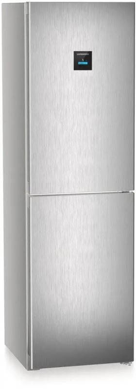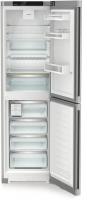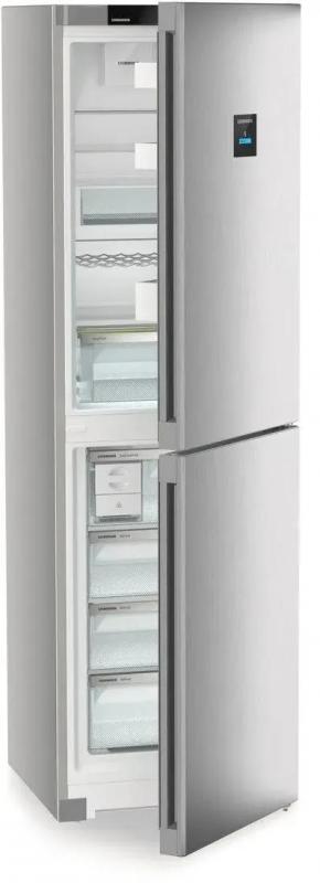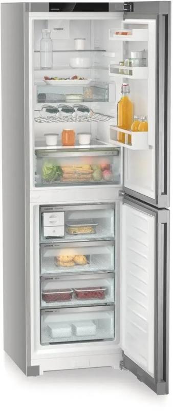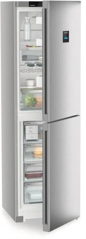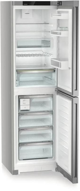 Холодильник LIEBHERR CNsfc 573i двухкамерный с нижним расположением морозильной камеры. Общий полезный объем 348 литров, из которых 225 литров приходится на холодильную камеру и 123 литра на морозильную. Температурный режим холодильного отделения варьируется от 2 до 9 °C, морозильного - от -26 до -15 °C. В холодильной камере используется капельная система размораживания, а в морозильной реализована технология No Frost. Модель оснащена инверторным компрессором с хладагентом R600a и имеет класс энергопотребления A++. Годовое потребление электроэнергии составляет 242 кВт*ч. Управление осуществляется сенсорным способом, внешний дисплей показывает температуру. Имеются зона свежести EasyFresh, механический льдогенератор, антибактериальный фильтр. Предусмотрены функции суперзаморозки, суперохлаждения и защита от детей. Звуковая сигнализация оповещает о незакрытой двери. Двери металлические с тремя полками, основные полки стеклянные, их пять штук, одна складная. Морозильное отделение содержит четыре ящика, мощность замораживания достигает 16 кг/сутки. При отключении электричества сохраняет холод в течение 24 часов. Двери перевешиваемые, ножки регулируются по высоте. Уровень шума не превышает 33 дБ. Размеры (ШхВхГ): 59.7 х 201.5 х 67.5 см, вес 79.4 кг.