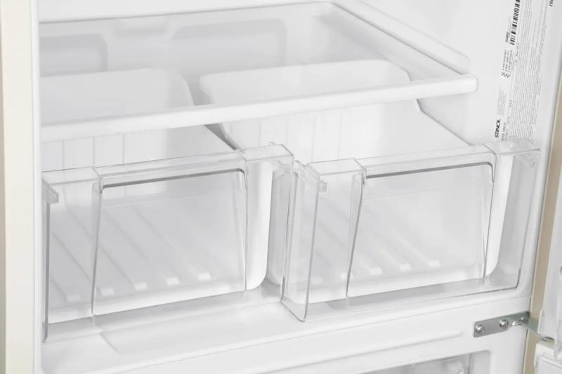 Холодильник STINOL STS 150 E с климатическим классом N имеет двухкамерную конструкцию с нижним расположением морозильной камеры. Общий объем составляет 263 литра, из которых 191 литр приходится на холодильную камеру и 72 литра на морозильную. Температура в холодильном отделении варьируется до 8 °C, в морозильнике поддерживается от -16 °C до -26 °C. Холодильная камера оснащена тремя стеклянными полками и двумя ящиками с капельной системой размораживания. Морозильное отделение содержит два ящика с ручным размораживанием и обеспечивает мощность замораживания до 2 кг/сутки. Управление электромеханическое. При отключении электричества сохраняет температуру до 15 часов. Годовое энергопотребление составляет 401.5 кВт*ч, класс энергоэффективности B. Используется хладагент R600a. Корпус выполнен из металла с LED подсветкой внутри. На дверце расположены три полки. Направление открывания двери справа. В комплекте предусмотрены регулируемые по высоте ножки. Цвет бежевый. Размеры (ШхВхГ) 60 х 150 х 62 см. Вес 56.2 кг.