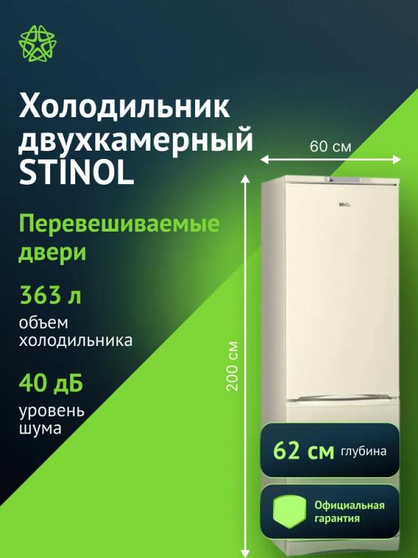Холодильник STINOL STS 200 E двухкамерный с нижним расположением морозильной камеры. Климатический класс N. Общий объем составляет 363 литра, полезный - 341 литр. Холодильное отделение содержит 235 литров общего объема и оснащено капельной системой размораживания, включает четыре стеклянные полки и два ящика. Морозильная камера объемом 128 литров имеет ручную систему размораживания, три ящика и способна замораживать до 2 кг продуктов в сутки при температуре от -16°C до -26°C. Управление электромеханическое, уровень шума достигает 40 дБ. Класс энергопотребления B, годовое потребление составляет 496 кВт*ч, время автономного хранения при отключении питания - 19 часов. Двери металлические с возможностью перевешивания, на них расположены три полки. Корпус бежевого цвета со светодиодной подсветкой внутри. Габариты устройства 60х200х62 см, вес 74.4 кг.