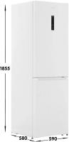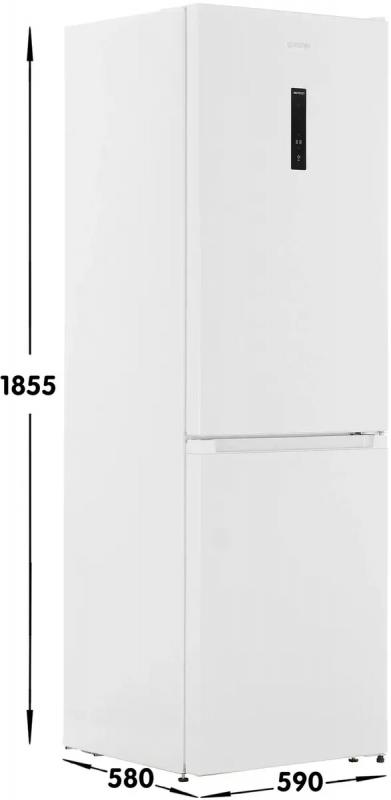 Холодильник двухкамерный GORENJE NRKP61EA2W4 — с нижней морозильной камерой, объемом 320 л (холодильная — 210 л, морозильная — 110 л). Обе камеры оснащены системой No Frost Plus, обеспечивающей автоматическое размораживание. Управление электронное, с внешним дисплеем и индикацией температуры и незакрытой двери. В холодильной камере — 3 стеклянные полки, 2 ящика и зона свежести FreshZone, на дверце — 3 полки. В морозильной камере — 1 полка и 2 ящика. Мощность замораживания — 12 кг/сут, режим FastFreeze. Класс энергопотребления A++, потребление — 240 кВт·ч/год, хранение при отключении — 17 ч. Один компрессор, перевешиваемые двери, регулируемые ножки. Уровень шума — 38 дБ. Подсветка LED. Цвет — белый. Габариты: 59,5 × 185 × 59,2 см. Вес нетто — 59 кг.