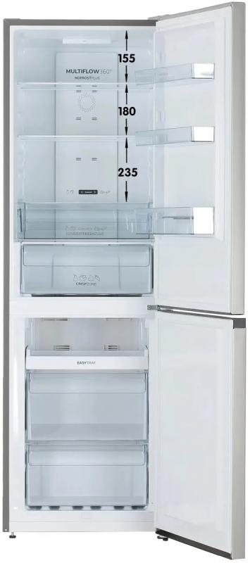 Холодильник двухкамерный GORENJE NRKP61EA2XL4 — с нижней морозильной камерой, общим объемом 320 л (холодильная — 210 л, морозильная — 110 л), системой No Frost Plus, электронным управлением и внешним дисплеем. Имеет две двери с возможностью перевешивания, три полки из закаленного стекла в холодильной камере, два ящика, зону свежести FreshZone, одну полку и два ящика в морозильной камере, три полки на дверце. Оснащен режимами отпуск и FastFreeze, индикацией температуры и звуковым сигналом незакрытой двери. Класс энергопотребления A++, потребление — 240 кВт·ч/год, хранение при отключении — 17 часов. Компрессор один, уровень шума 38 дБ. Ножки регулируемые, дверь открывается вправо. Цвет корпуса — серебристый металлик. Габариты: 59,5 х 185 х 59,2 см, вес нетто — 59 кг.