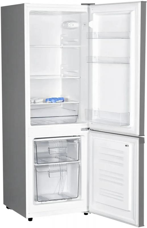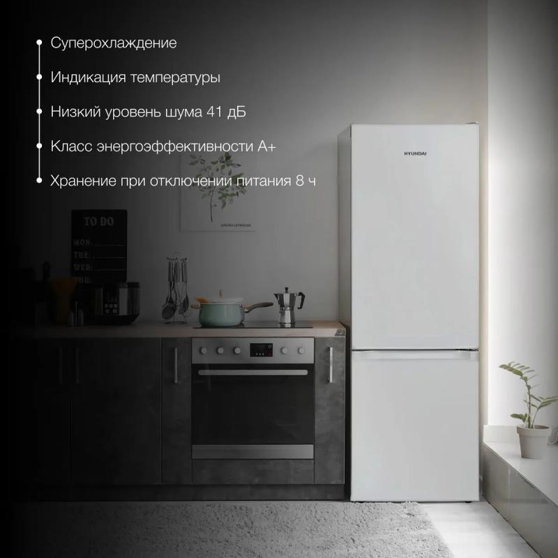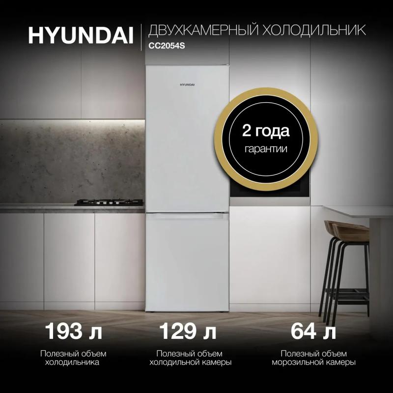 Холодильник HYUNDAI CC2054SL двухкамерный с нижним расположением морозильной камеры. Климатические классы N и ST. Общий объем 168 литров, полезный объем 154 литра. Холодильное отделение содержит 120 литров, имеет три полки из закаленного стекла и один ящик. Морозильная камера объемом 34 литра оснащена двумя ящиками, мощность замораживания составляет 2 кг/сутки. Управление механическое, уровень шума 39 дБ. Класс энергопотребления A+, годовое потребление энергии 191 кВт*ч, время сохранения холода при отключении питания 8 часов. Хладагент R600a массой 51 грамм. На дверце расположены три полки. Цвет корпуса серебристый. Габариты холодильника 48.5х143х54 см, вес 40 кг.