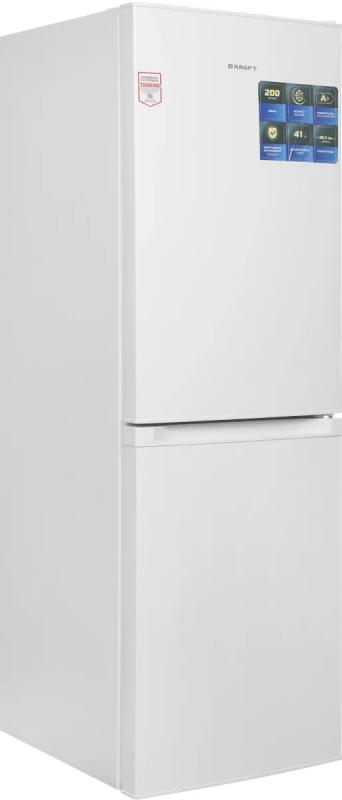 Холодильник двухкамерный KRAFT KF-NF271W — с верхней холодильной и нижней морозильной камерами, оснащенный электронным управлением и системой No Frost в обеих камерах. Общий объем 200 л, из них 134 л — холодильная камера с 2 стеклянными полками и 1 ящиком, 66 л — морозильная камера с 3 ящиками. Мощность замораживания 3 кг/сут, температура в морозильной камере до -18 °С. Хладагент R600a, один стандартный компрессор. Класс энергопотребления A+, потребление 209 кВт·ч/год. Двери перевешиваемые, открываются вправо, материал — металл, на дверце 3 полки. Ножки регулируемые по высоте. Частота сети 50 Гц, вилка ЕВРО. Уровень шума 41 дБ. Размеры (Ш×В×Г): 48,5 × 158,3 × 59,8 см, вес нетто 38 кг.