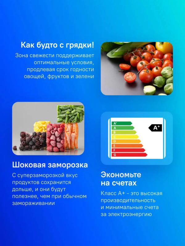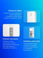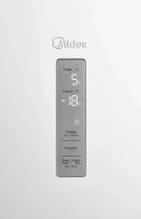 Холодильник двухкамерный MIDEA MDRB471MGF01O — с нижней морозильной камерой, оснащённый системой No Frost в обоих отсеках. Общий полезный объём составляет 346 л (холодильная камера — 223 л, морозильная — 123 л). Управление сенсорное с внешним дисплеем, предусмотрены функции суперохлаждения, суперзаморозки, режима «отпуск» и защиты от детей. Температура в холодильной камере регулируется от 2 до 8 °C, в морозильной — от –16 до –24 °C. Мощность замораживания — 14 кг/сут. Холодильник имеет три стеклянные полки и два ящика в холодильном отделении, один полку и два ящика в морозильном, три полки на дверце, зону свежести, LED-подсветку и антибактериальное покрытие. Корпус белого цвета выполнен с возможностью перевешивания дверей, регулируемыми ножками и нулевым зазором. Уровень шума — 42 дБ, класс энергопотребления — A+, потребление — 316 кВт·ч/год, автономное хранение — 15 часов. Размеры (Ш×В×Г): 59.5 × 185 × 66 см, вес: 65 кг.