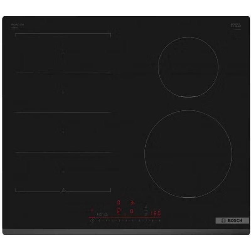 Serie 4, индукционная варочная поверхность, стеклокерамика, дизайн со скошенным фронтом, черная, ширина 60 см, 4 конфорки, конфорки слева можно объединить в CombiZone, управление TouchSelect, функция PowerBoost, распознавание иналичия посуды, таймеры прямого отсчета, таймер отключения всех конфорок, индикация остаточного тепла, блокировка от детей, сделано в Испании.