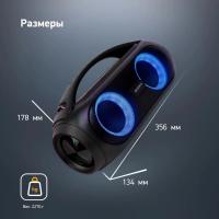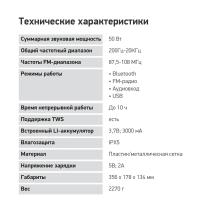 Колонка DIGMA D-PS1530 работает через Bluetooth 5.1 с поддержкой A2DP и имеет радиус действия до 10 метров. Звуковая система 2.1 обеспечивает суммарную мощность 50 Вт при частотном диапазоне 200 Гц - 20 кГц и отношении сигнал/шум 65 дБ. Встроенный FM-радиоприемник работает в диапазоне 87.5-108 МГц. Комплектация включает два 3-дюймовых СЧ динамика, один 2-дюймовый НЧ динамик и AUX кабель с USB кабелем. Устройство оснащено USB 2.0, AUX входом и регуляторами на верхней панели. Поддерживает кодеки MP3, WMA, WAV, Flac, AMR. Защищена по стандарту IPX5 и имеет светомузыку. Питается от сети или встроенного аккумулятора Li-Ion емкостью 3000 mAh, обеспечивающего до 15 часов работы после 3 часов зарядки. Возможна связь двух колонок одновременно. Корпус из пластика и ткани черного цвета. Размеры 356 x 178 x 134 мм, вес 2.27 грамма.