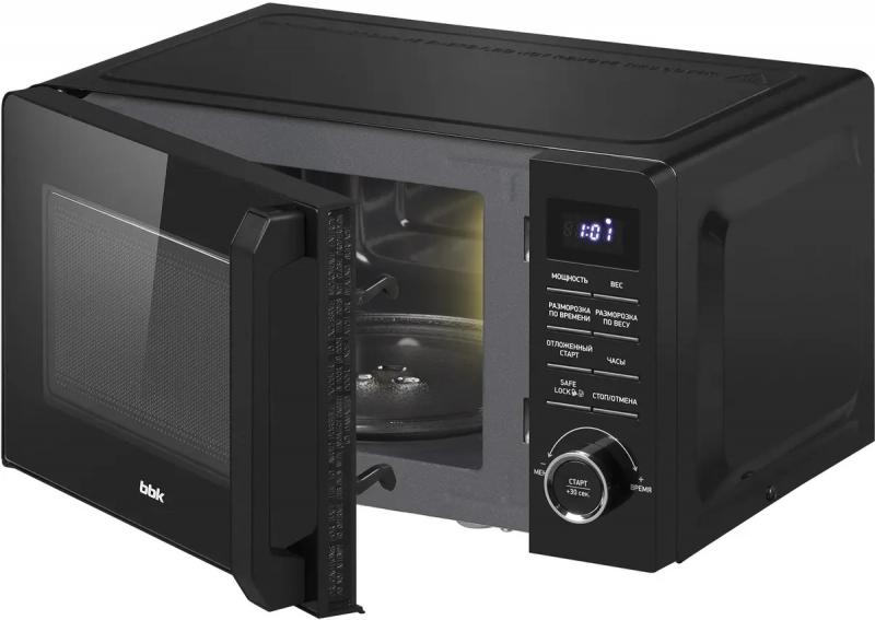 Микроволновая печь BBK 20MWS-723T/B (B) имеет объем 20 литров и мощность 700 Вт. Управление осуществляется механическим способом с помощью тактовых переключателей. Дверца открывается ручкой справа налево. На корпусе расположен дисплей и часы. Модель оснащена звуковым сигналом окончания приготовления, кнопкой быстрой установки времени +30 секунд и регулировкой мощности на 11 уровней. Внутренняя камера покрыта эмалью, диаметр поворотного стола составляет 245 мм. В устройстве доступно 7 программ, включая автоматическую разморозку, разогрев и режим соло. Предусмотрена функция размораживания по весу и защита от детей. Таймер отключения может быть установлен на период до 99 минут. Цвет корпуса черный. Габариты прибора составляют 45х24х36 см, вес 9.7 кг.