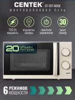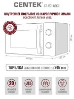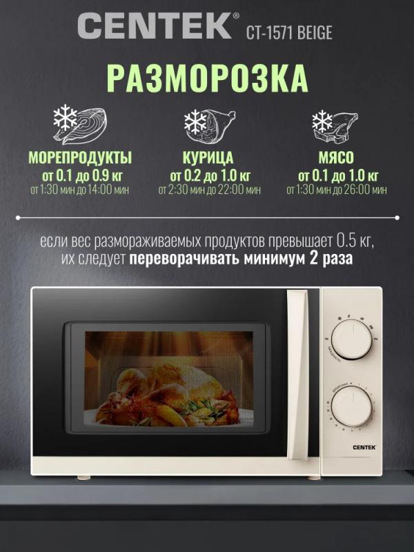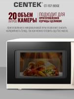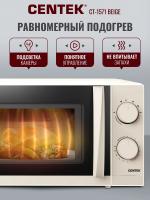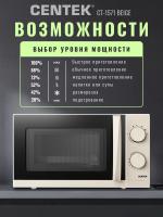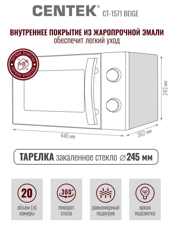 Механическим управлением CENTEK CT-1571 — с , объемом 20 л и мощностью микроволн 700 Вт. Дверца открывается ручкой справа налево, внутри камера покрыта жаропрочной эмалью, диаметр поворотного стола составляет 245 мм. Регулировка мощности осуществляется на 6 ступенях, предусмотрен звуковой сигнал окончания работы и таймер отключения с максимальным временем 30 минут. Режим работы — соло. Габариты устройства: 46 х 27 х 39 см, внутренние размеры камеры: 45,2 х 26,2 х 35 см. Вес товара — 11 кг. Цвет бежевый.