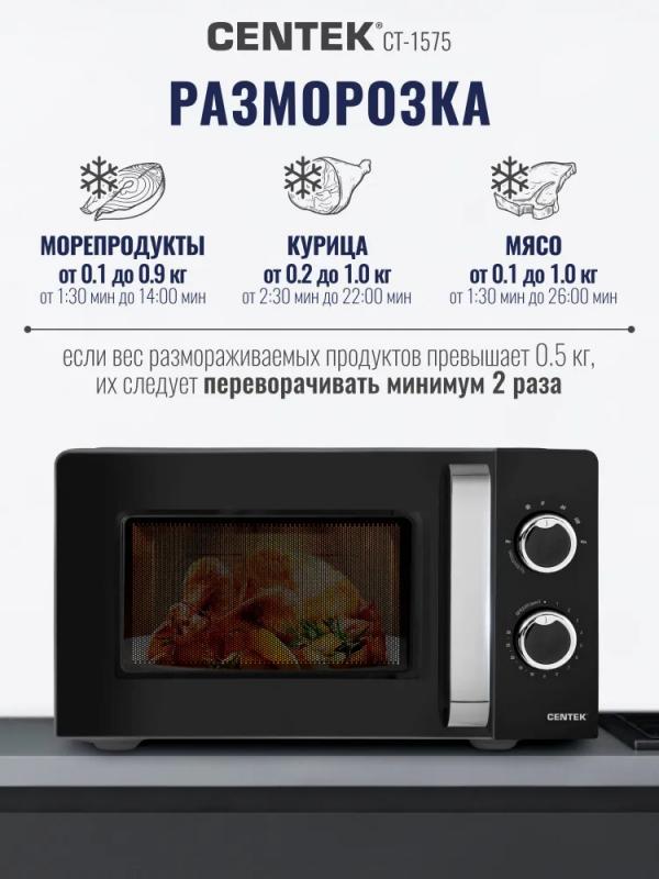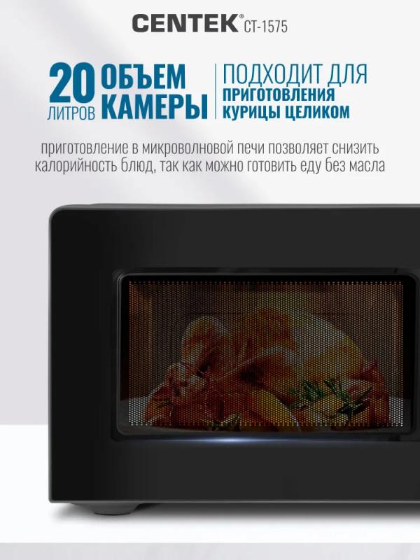 Микроволновая печь CENTEK CT-1575 — с механическим управлением, объемом 20 л и мощностью микроволн 700 Вт. Дверца открывается ручкой справа налево. Управление включает звуковой сигнал окончания работы и шесть ступеней регулировки мощности. Внутренняя камера покрыта эмалью легкой очистки, диаметр поворотного стола составляет 245 мм. Режимы: автоматическая разморозка и соло. Функция таймера отключения с максимальным временем 30 минут. Цвет корпуса — черный. Габариты: 44,6 × 24,5 × 36 см. Вес товара — 10 кг.