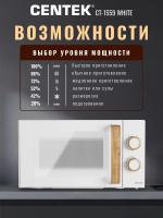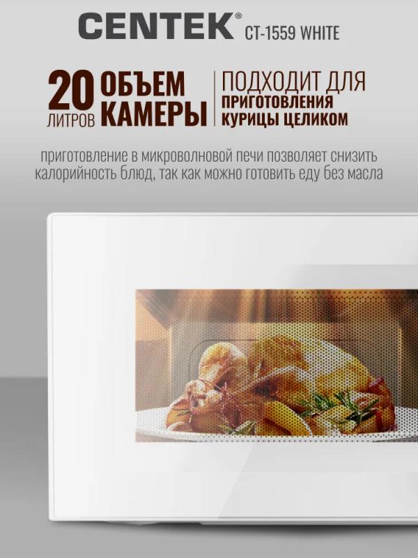 Микроволновая печь CENTEK CT-1559 — с механическим управлением, объемом 20 л и мощностью микроволн 700 Вт. Дверца открывается ручкой справа налево. Внутренняя камера покрыта эмалью. Предусмотрена регулировка мощности на шести ступенях. Режим работы — соло. Функция таймера позволяет установить время работы до 30 минут. Устройство имеет белый цвет исполнения. Габариты и вес: 48,5 × 38,5 × 29,5 см, 15,5 кг.