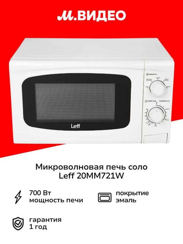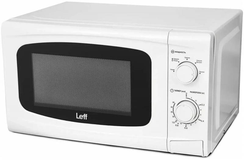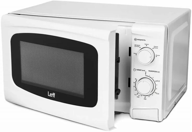 Микроволновая печь LEFF 20MM721W имеет объем 20 литров и мощность 700 Вт. Оснащена механическим управлением с пятью уровнями регулировки мощности. Дверца открывается кнопкой справа налево. Внутренняя камера покрыта эмалью, диаметр поворотного стола составляет 245 мм. Предусмотрены режимы автоматической разморозки и соло. Имеется таймер на отключение с максимальным временем 35 минут. Цвет корпуса белый. Габариты прибора 44х26х35.5 см, вес 10.5 кг.