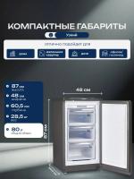 Морозильная камера Бирюса W412 Matte graphite имеет общий объем 80 литров и полезный объем морозильной камеры 58 литров. Оснащена стандартным компрессором с хладагентом R600a и механическим управлением. Обеспечивает мощность замораживания до 7 кг/сутки при ручном размораживании. Включает три отсека для заморозки с тремя ящиками. Дверь с внутренней ручкой перенавешивается, направление открытия - направо. Имеется световая индикация режима работы и сигнал о повышении температуры. При отключении питания сохраняет холод до 10 часов. Климатический класс N-ST. Потребляемая мощность составляет 65 Вт, длина сетевого шнура - 1.25 м. Годовое энергопотребление - 211.7 кВтч, класс энергоэффективности A. Максимальный уровень шума - 41 дБ. Размеры: 87х48х60.5 см, вес 28.5 кг.