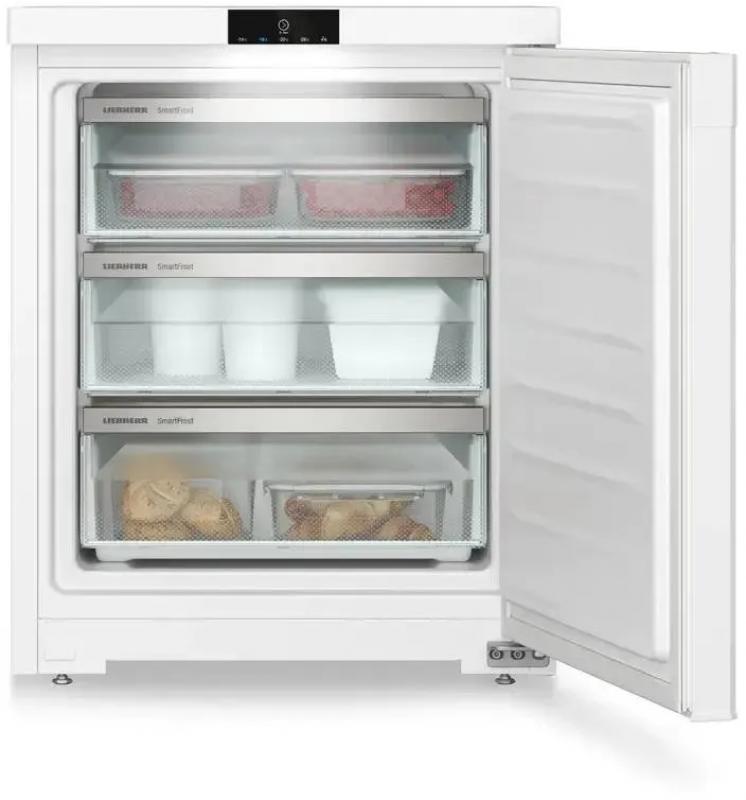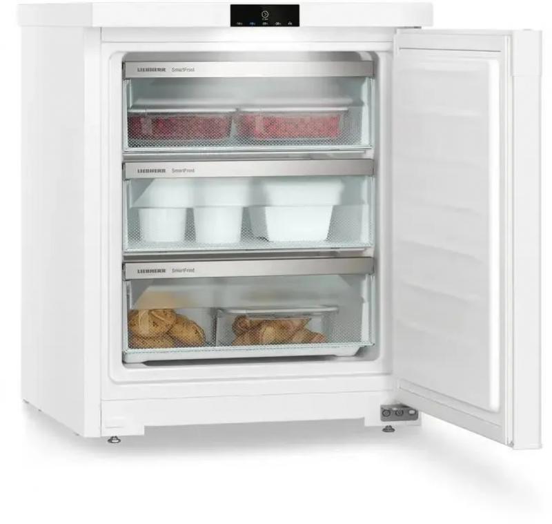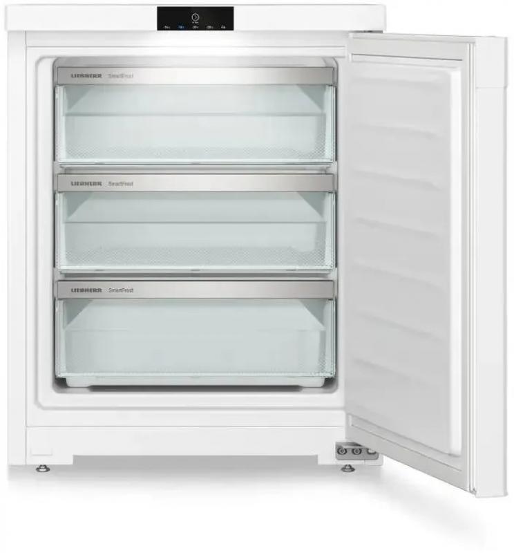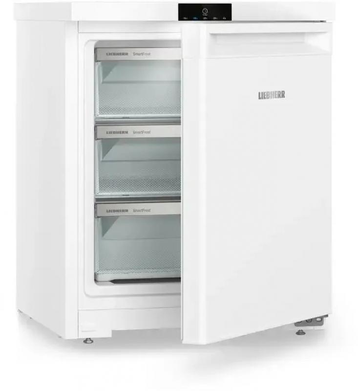 Морозильная камера LIEBHERR Fe 1003 с электронным управлением и внешним дисплеем работает на хладагенте R600a. Однокамерный прибор имеет один компрессор и три ящика. Общий объем 76 л, полезный - 75 л. Система размораживания ручная, технология Smart Frost. Климатические классы N, SN, ST, T обеспечивают работу в неотапливаемых помещениях. Минимальная температура -28 °С, максимальная -16 °С. Потребление энергии 163 кВт*ч/год, класс энергопотребления A++ по европейской классификации E. Уровень шума 37 дБ. При отключении питания поддерживает холод 13.5 часов. Есть защита от детей, индикация работы, температуры и незакрытой двери. Размеры 55х68х60.7 см, вес 31 кг.