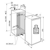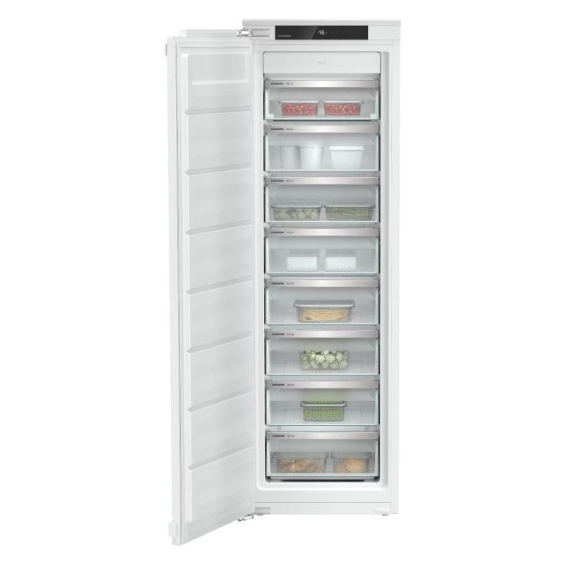 Встраиваемая морозильная камера Liebherr SIFNe 5108-22 001 оснащена инверторным компрессором и системой No Frost. Общий объем составляет 209 литров, есть 8 ящиков для хранения продуктов. Мощность замораживания достигает 18 кг/сутки. Управление сенсорное, на дисплее отображается температура. Имеется режим суперзаморозки и защита от детей. Прибор подает звуковые и световые сигналы при открытой двери или повышении температуры. Время сохранения холода при отключении электроэнергии - 14 часов. Годовое энергопотребление составляет 307 кВтч, класс энергоэффективности A+. Уровень шума не превышает 35 дБ. Дверь перенавешиваемая, ручка скрытого типа. Для установки требуется ниша размером 1788х570х550 мм. Габариты прибора 1770х559х546 мм, вес 58.1 кг.