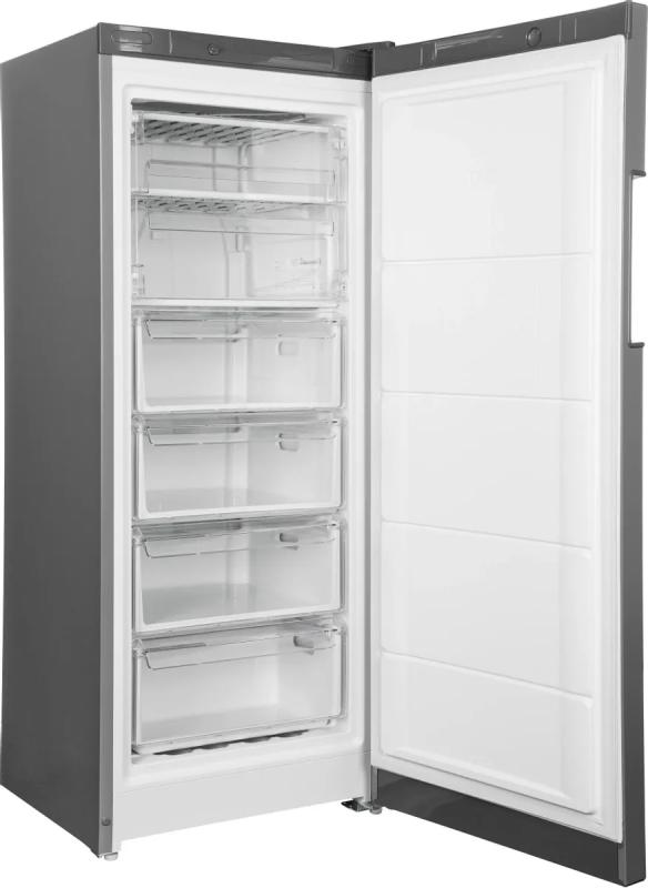 Морозильный шкаф INDESIT DSZ 4150 G с механическим управлением и одним компрессором работает на хладагенте R600a. Объем морозильной камеры составляет 214 литров, система размораживания ручная. Мощность замораживания достигает 10 кг/сутки, годовое потребление энергии 256 кВт*ч при классе энергоэффективности A+. Устройство сохраняет температуру при отключении питания до 17 часов. Корпус выполнен с металлическими дверями серебристого цвета, имеет один отсек с четырьмя ящиками и двумя полками. Уровень шума составляет 43 дБ, климатический класс SN/T. Габариты модели 60х150х63 см, вес 55.2 кг.