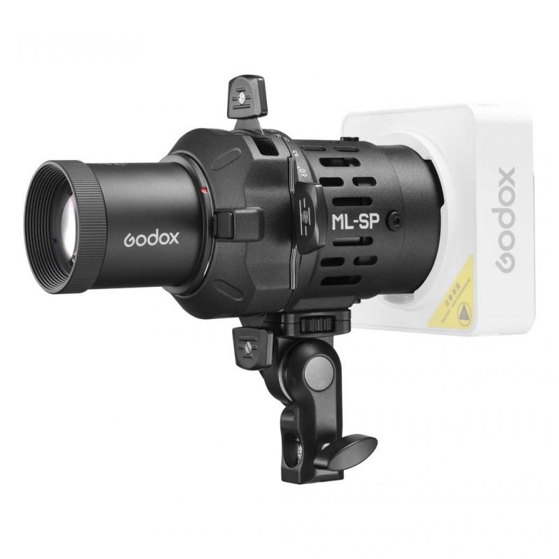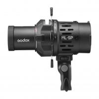 Насадка проекционная Godox ML-SP. Байонет Godox. Совместимость с осветителями ML60II Bi. ML100Bi. ML100R. Компактный размер. Регулировка фокуса объектива. Сменные оптические линзы. Создание световых эффектов. Проекция изображений. Возможность расфокусировки для мягких краев. Вес: 320 г.