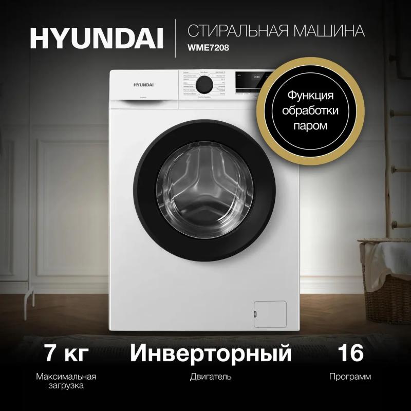 Стиральная машина HYUNDAI WME7208 с фронтальной загрузкой на 7 кг белья оснащена инверторным мотором и барабаном из нержавеющей стали SUS430. Включает 16 программ и функцию обработки паром. Возможна регулировка температуры стирки. Класс энергопотребления A+++. Расход воды составляет 44 литра за цикл. Питание от сети 50 Гц. Размеры прибора: ширина 60 см, высота 84 см, глубина 45 см. Вес составляет 58 кг. Корпус выполнен в белом цвете.