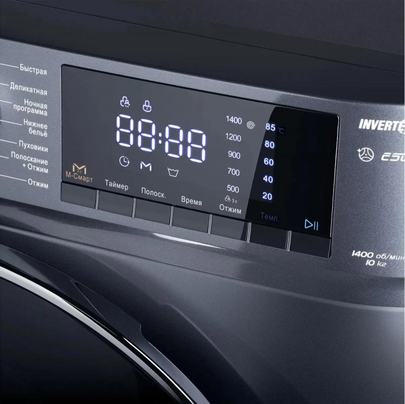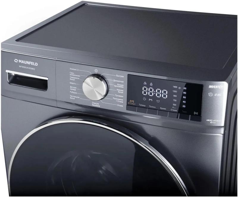 Стиральная машина MAUNFELD MFWM1410SB02 с фронтальной загрузкой на 10 кг белья оснащена инверторным мотором и электронным управлением с русскоязычной панелью. Диаметр люка 33 см, открывание влево. Максимальная скорость отжима 1400 об/мин, уровень шума при стирке 62 дБ, при отжиме 76 дБ. Расход воды 70 л. Предусмотрены защита от детей, контроль дисбаланса и пены, таймер отсрочки до 24 часов. Включает 15 программ, в том числе хлопок, гипоаллергенная, быстрая, шерсть, пуховики. Класс стирки A, отжима C, энергопотребления A+++. Пластиковая крышка, регулируемые ножки. Габариты 60х84.7х50 см, вес 65.46 кг. Цвет темно-серебристый, люк черный.