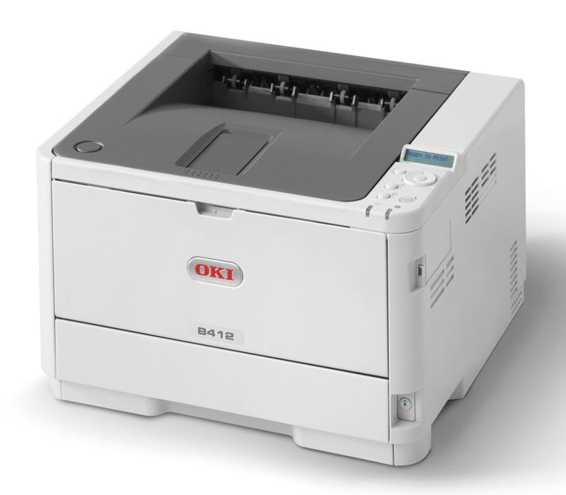 Монохромный принтер OKI B412dn - Euro. Формат А4, скорость печати А4 33 стр./мин., разрешение 1200 x 1200 точек на дюйм, лоток подачи бумаги на 250 листов, интерфейс Hi-Speed USB 2.0, 1000BASE-T/100BASE-TX/10BASE-T