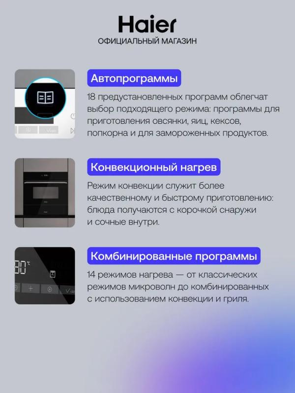 Встраиваемая микроволновая печь HAIER HMX-BDC399B имеет объем 40 литров и мощность микроволн 900 Вт. Управление сенсорное с возможностью регулировки мощности. Дверца открывается сверху вниз с помощью ручки. Внутреннее покрытие камеры выполнено из эмали. Модель оснащена автоматической разморозкой, автоматическим разогревом, режимами гриль, конвекция, гриль+конвекция и микроволны+конвекция. Мощность гриля составляет 1750 Вт. На корпусе расположен дисплей. Имеется блокировка от детей и таймер на отключение до 1440 минут. В комплект входит решетка для гриля. Цвет корпуса черный, длина кабеля питания 1 метр. Габариты прибора 59.5х45.5х57 см, размеры ниши для встраивания 56.4х45.5х56 см. Вес устройства 39 кг.