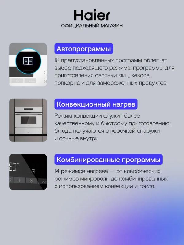 СВЧ-печь HAIER HMX-BDC399W оснащена сенсорным управлением и функцией регулировки мощности. Модель имеет объем 40 л и мощность микроволн 900 Вт. Дверца открывается сверху вниз с помощью ручки. Внутренняя камера покрыта эмалью. Встроенный гриль мощностью 1750 Вт работает в комбинированных режимах с конвекцией и микроволнами. Предусмотрены автоматическая разморозка и разогрев. Корпус оснащен дисплеем, таймером на 1440 минут и защитой от детей. В комплект входит решетка для гриля. Печь выполнена в белом цвете, длина кабеля питания составляет 1 м. Размеры устройства 59.5х45.5х57 см, размеры ниши для встраивания 56.4х45.5х56 см, вес 39 кг.