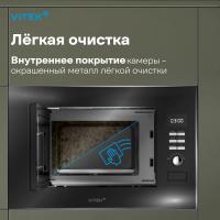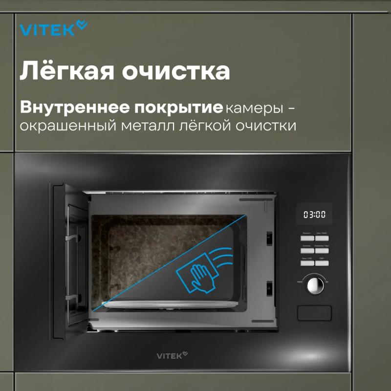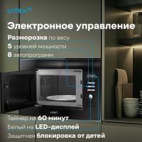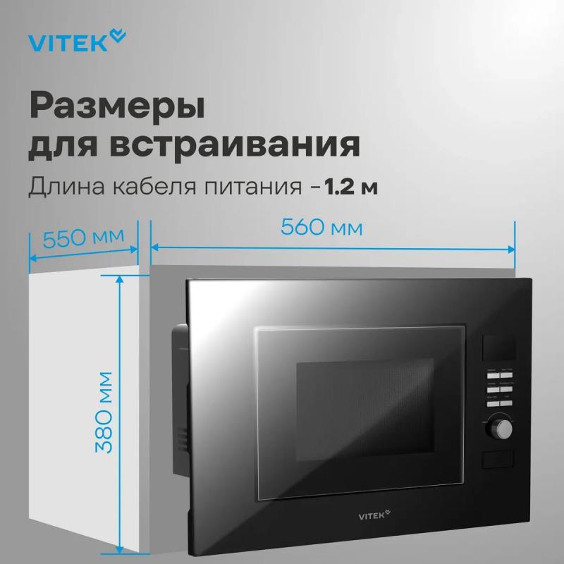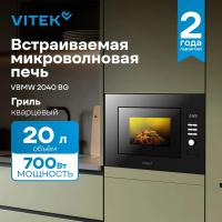 Микроволновая печь VITEK VBMW 2040 BG имеет объем 20 литров и мощность микроволн 700 Вт. Управление электронное с пятью ступенями регулировки мощности. Дверца открывается кнопкой справа налево. Внутреннее покрытие камеры выполнено из окрашенного металла. Диаметр поворотного стола составляет 245 мм. Модель оснащена кварцевым грилем мощностью 800 Вт. Имеется внутреннее освещение и таймер на отключение до 60 минут. Цвет корпуса черный, длина кабеля питания 1.2 м. Габариты печи 59.6 х 38.9 х 31.4 см, размеры ниши для встраивания 56 х 38 х 55 см.