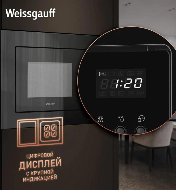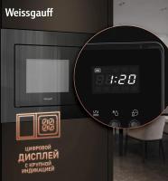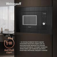 Микроволновая печь WEISSGAUFF BMWO-206 обладает объемом 20 л и мощностью 800 Вт, оснащена комбинированным управлением с кнопкой +30 секунд и 5 ступенями регулировки мощности, открывание дверцы осуществляется кнопкой справа-налево, внутреннее покрытие камеры выполнено из нержавеющей стали, диаметр поворотного стола составляет 245 мм, включает 8 программ и режимы автоматической разморозки, разогрева, приготовления, гриля, дополнительные режимы микроволны+гриль и размораживание по весу, особенности корпуса включают дисплей и часы, предусмотрено внутреннее освещение и блокировка от детей, таймер на отключение до 95 минут, комплектуется решеткой для гриля, цвет корпуса черный, размеры (ШхВхГ) 59.4 х 38.8 х 34.4 см, размеры ниши (ШхВхГ) 56 х 37 х 34 см, вес 13.5 кг.
