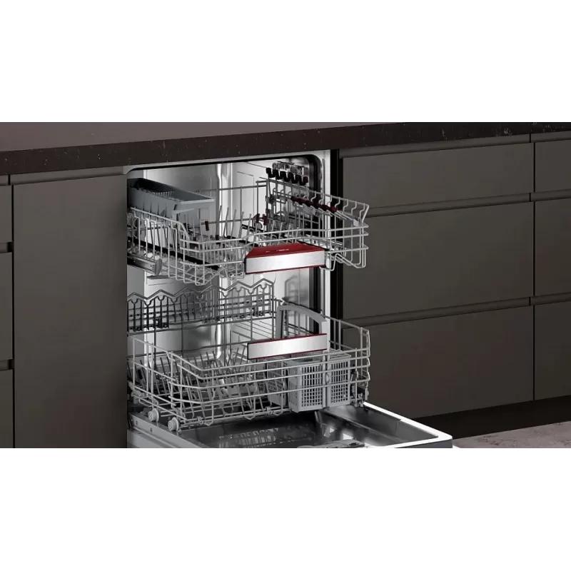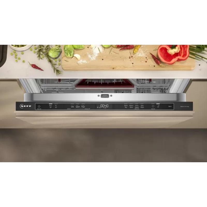 Встраиваемая посудомоечная машина NEFF S197EB801E оснащена сенсорным управлением и дисплеем. Вмещает 13 комплектов посуды. Система сушки работает через теплообменник с функцией Open Dry. Есть программы автоматическая, быстрая/один час, Eco, избранная. Дополнительные функции включают IntensiveZone/Power Zone, гигиена+, VarioSpeed Plus, экстра сушка, самоочистка, Machine Care/Easy Clean. Три корзины для загрузки. Мотор EcoSilence Drive. Aqua-Sensor и EmotionLight. Индикация окончания программы звуковая. Электронные индикаторы соли и ополаскивателя. Защита от протечек AquaStop и блокировка от детей. Уровень шума 42 дБ. Потребляет 2,4 кВт энергии. Внутренний резервуар из нержавеющей стали. Класс энергопотребления B, класс мытья А, класс сушки А. Расход воды за цикл 9 л, энергопотребление 0,54 кВт/ч. Габариты 815х598х550 мм, вес 39,1 кг.