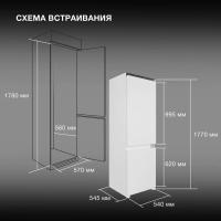 Годовое энергопотребление составляет 283.24 кВт*ч, что соответствует классу энергоэффективности A+. Холодильник работает от электросети с напряжением 220-240 В и частотой 50 Гц. В качестве хладагента используется R600a. Для встраивания требуется ниша размерами 56-57 см в ширину, 177-177.8 см в высоту и 55 см в глубину. Габариты самого прибора составляют 54х177х54.5 см. Корпус выполнен в белом цвете.