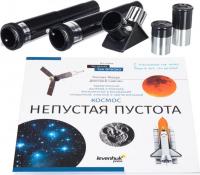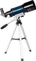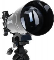 Телескоп Levenhuk Discovery Spark 703 AZ выполнен по схеме ахроматического рефрактора с азимутальной монтировкой. Объектив имеет диаметр 70 мм и фокусное расстояние 300 мм. Относительное отверстие составляет f/10. Максимальное полезное увеличение достигает 140х. Оптика изготовлена из оптического стекла с антибликовым покрытием. Разрешающая способность — 4 угловых секунд. Проницающая способность составляет приблизительно 11.33 звездной величины. Посадочный диаметр окуляров — 0.965 дюйм. Фокусировка осуществляется с помощью реечного фокусера. Управление телескопом ручное с удобной ручкой наведения. В комплектацию входят окуляры H6 мм, H20 мм, оборачивающий окуляр 1.5x, линза Барлоу 3x и диагональное зеркало 90°. Тренога настольная алюминиевая высотой 350 мм. Труба выполнена из металла. Вес: 2.1 кг.
