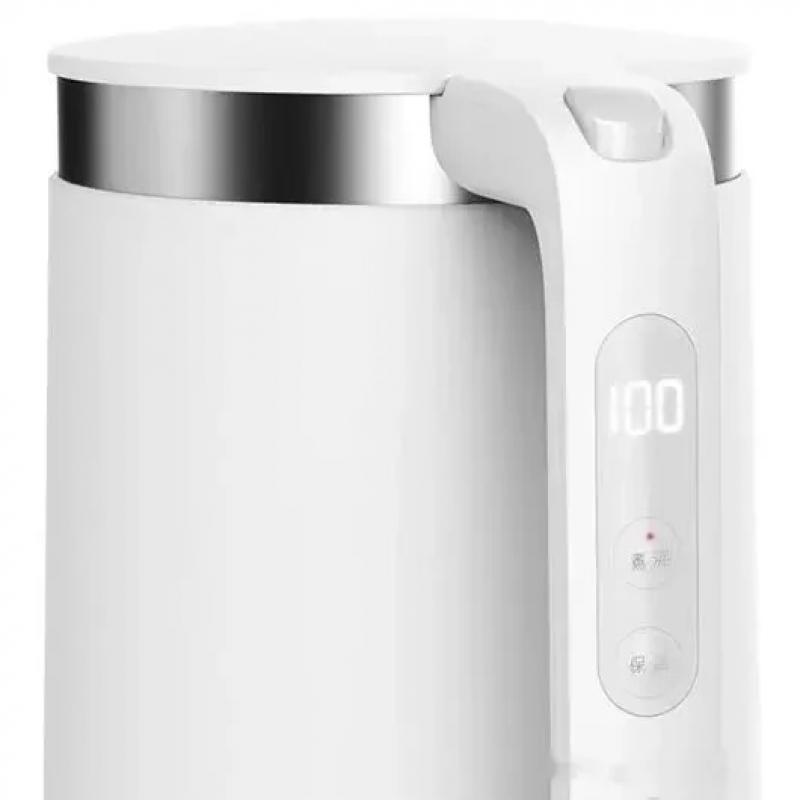 Чайник, объем 1.5 л., мощность 1800 Вт, нагревательный элемент скрытый, корпус пластик, двойные стенки, открывание крышки кнопкой, поддержание t°, термометр, терморегулятор, управление со смартфона, вес 1.26 кг, белый.