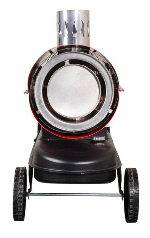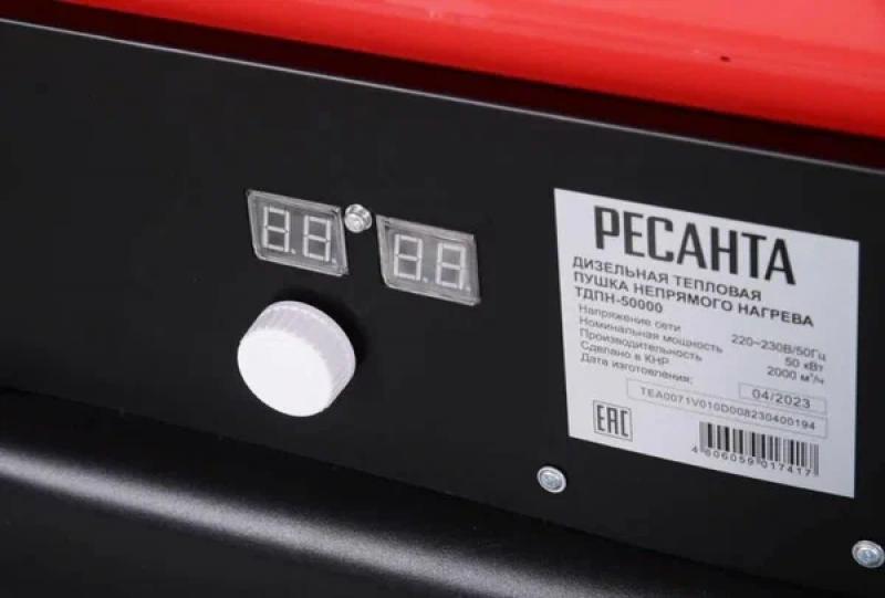 Тепловая пушка РЕСАНТА ТДПН-50000 — дизельная модель с непрямым нагревом, оснащённая пьезоподжигом, термостатом, системой контроля пламени и защитой от перегрева. Обеспечивает тепловую мощность 50 кВт при производительности 2000 м³/ч и расходе топлива 3,96 кг/ч. Работает от дизельного топлива, объём бака — 68 л, время непрерывной работы — до 15 часов. Корпус металлический, цилиндрической формы, красного цвета, снабжён колёсами и ручкой для перемещения, а также индикацией уровня топлива. Питание от сети 220 В. Размеры: 110.7х76.5х49.6 см. Вес: 57.8 кг.