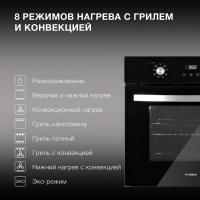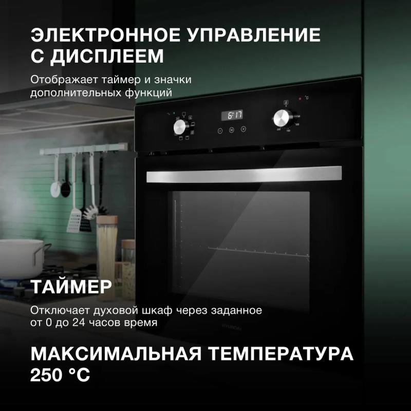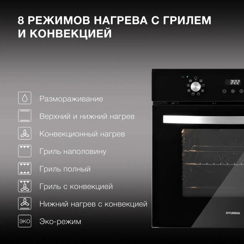 Духовой шкаф HYUNDAI HEO 6647 BG электрический. Мощность подключения составляет 2300 Вт, максимальная температура нагрева достигает 250 °С. Управление осуществляется поворотными и сенсорными переключателями. Оснащен электронным таймером и дисплеем. Внутреннее покрытие выполнено из эмали легкой очистки Easy Clean. Имеются режимы гриля и конвекции, освещение обеспечивается галогенной лампой мощностью 25 Вт. Дверца открывается вниз, содержит три стекла. Цвет черный с серебристыми элементами. Класс энергоэффективности A. Размеры 59.5х57.7х59.5 см, вес 33.2 кг.