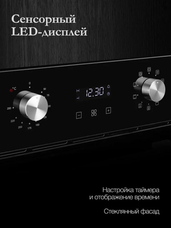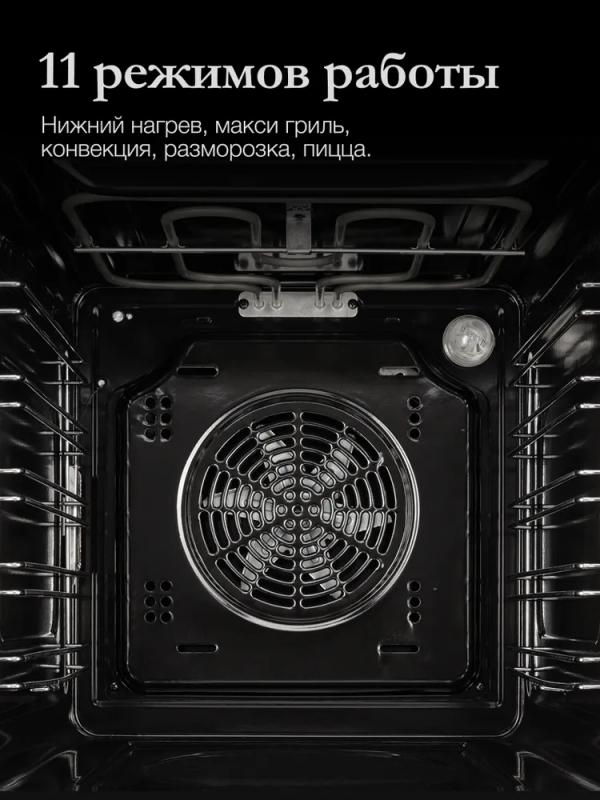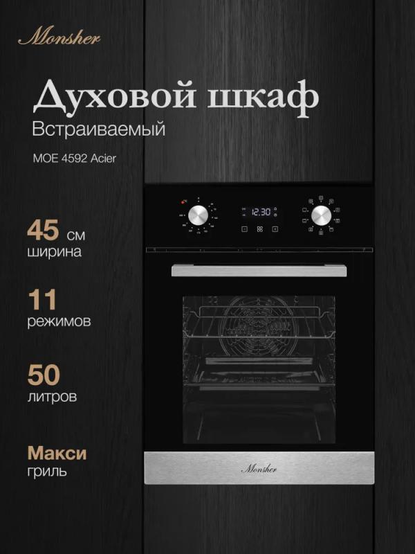 Электрический духовой шкаф Monsher MOE 4592 Acier имеет объем 50 л и 9 режимов работы. Оснащен электронным управлением, галогеновым освещением и системой гидролизной очистки. Дверца с 3-слойным стеклом открывается вниз, предусмотрена блокировка и плавное открытие. Максимальная температура нагрева составляет 250 °C. В комплект входят термощуп, металлическая решетка, два противня и решетка для гриля. Потребляемая мощность 2800 Вт, класс энергоэффективности A. Габариты 600х430х560 мм, вес 26.8 кг.