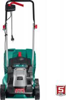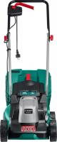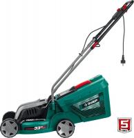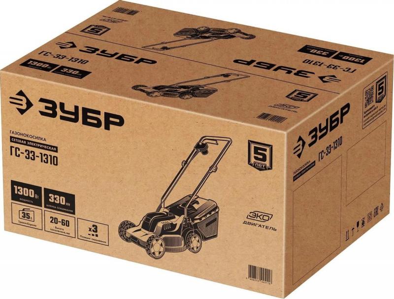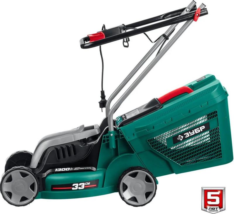 Газонокосилка ЗУБР ГС-33-1310 с электрическим двигателем 1300 Вт. Несамоходная, с ножом, задним выбросом травы в жесткий травосборник объемом 35 л. Четырехколесная, колеса из пластика. Ширина скашивания — 33 см, высота от 20 до 60 мм (3 уровня, осевая регулировка). Отсутствие мульчирования, транспортировочных ручек, регулировки ручки по высоте. Защита IPX4. Питание от электросети. В комплекте: травосборник, рукоятки, крепеж, инструкция. Размеры: 56х31х40 см. Вес: 9 кг.