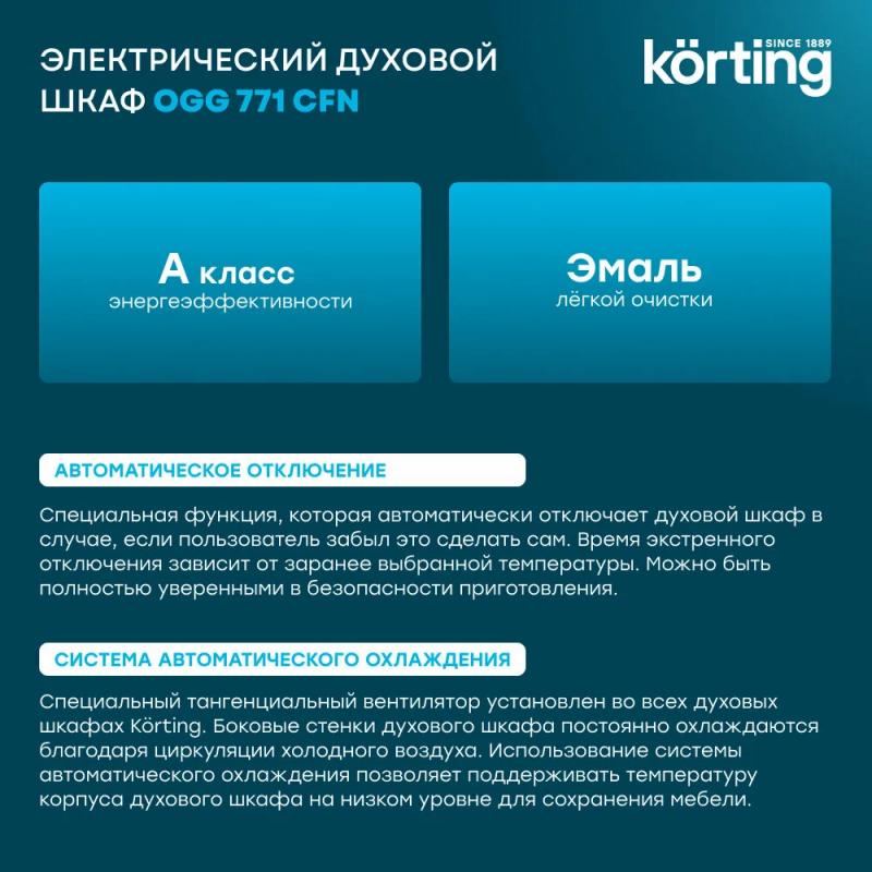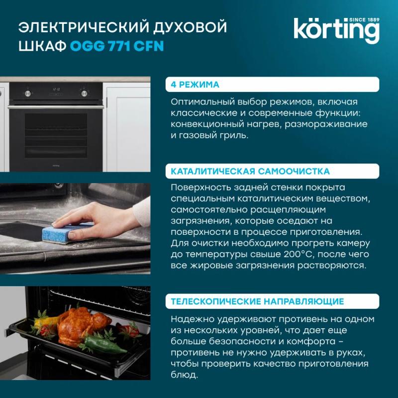 Газовый духовой шкаф KORTING OGG 771 CFN оснащен поворотными и сенсорными переключателями. Класс энергоэффективности A. Объем 60 литров. Максимальная температура нагрева 250 °C. Имеет конвекцию и газовый гриль. Включает электроподжиг и систему газ-контроля. Дисплей и электронный таймер присутствуют. Предусмотрено 4 программы: газовый гриль, конвекционный нагрев, нижний нагрев и размораживание. Вентилятор охлаждения и однокаскадные телескопические направляющие в комплекте. Дверца открывается вниз. Тройное стекло дверцы. Подсветка на 25 Вт. Звуковая индикация и защитное отключение включены. Длина кабеля 1.35 м. Цвет черный. Габариты изделия 59.5 х 58.5 х 59.6 см. Размеры для встраивания 56 x 56.5 x 59 см.