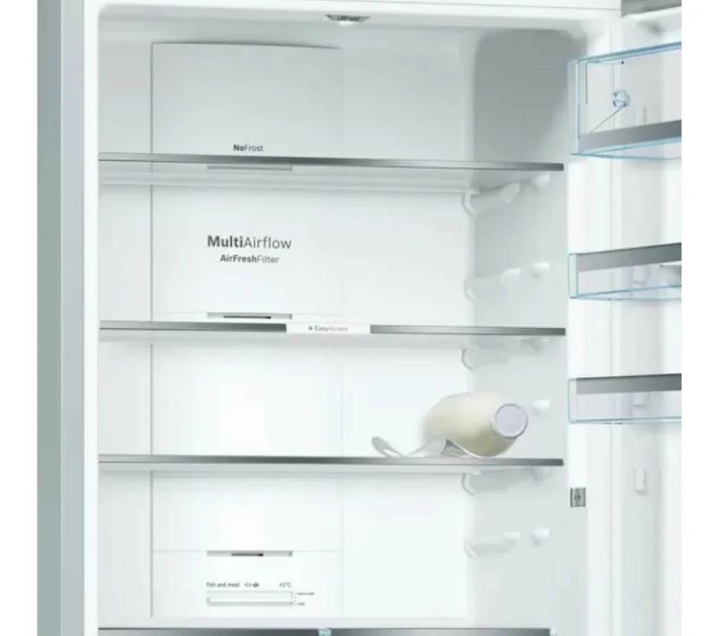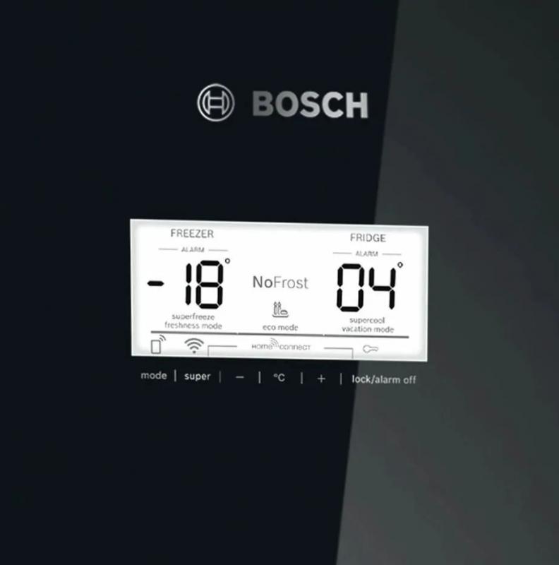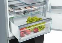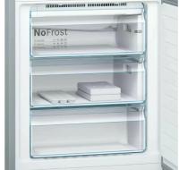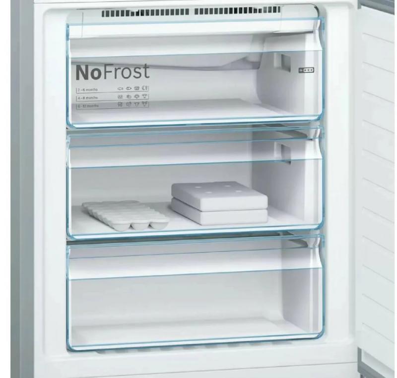 Холодильник BOSCH KGN49LB30U имеет двухкамерную конструкцию с нижним расположением морозильной камеры. Общий объем составляет 435 литров, из которых 330 литров приходится на холодильную камеру и 105 литров на морозильную. В обеих камерах реализована система размораживания No Frost. Холодильная камера содержит 4 стеклянные полки и 2 ящика, морозильная камера включает 3 ящика с мощностью замораживания 15 кг/сутки. Управление электронное с внешним дисплеем. Предусмотрены функции суперзаморозки и суперохлаждения. Класс энергопотребления A++ при годовом потреблении 303 кВт*ч. Хранение при отключении питания до 20 часов. Уровень шума составляет 40 дБ. Используется хладагент R600a и один стандартный компрессор. Двери металлические с возможностью перевешивания, имеется 4 полки на дверце. Корпус черного цвета. Размеры 70х203х67 см, вес 103.3 кг.