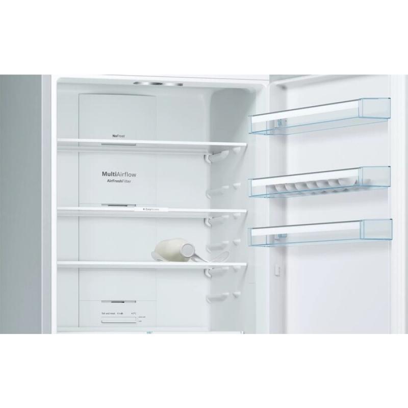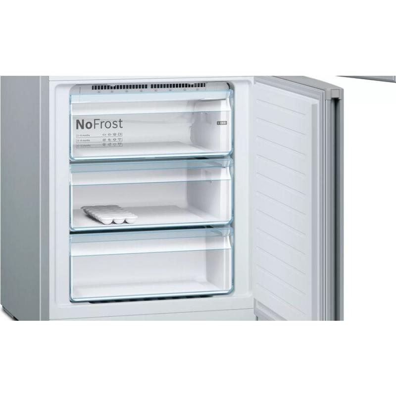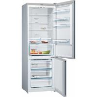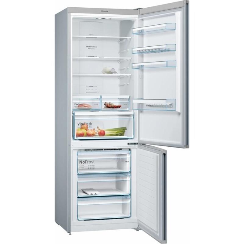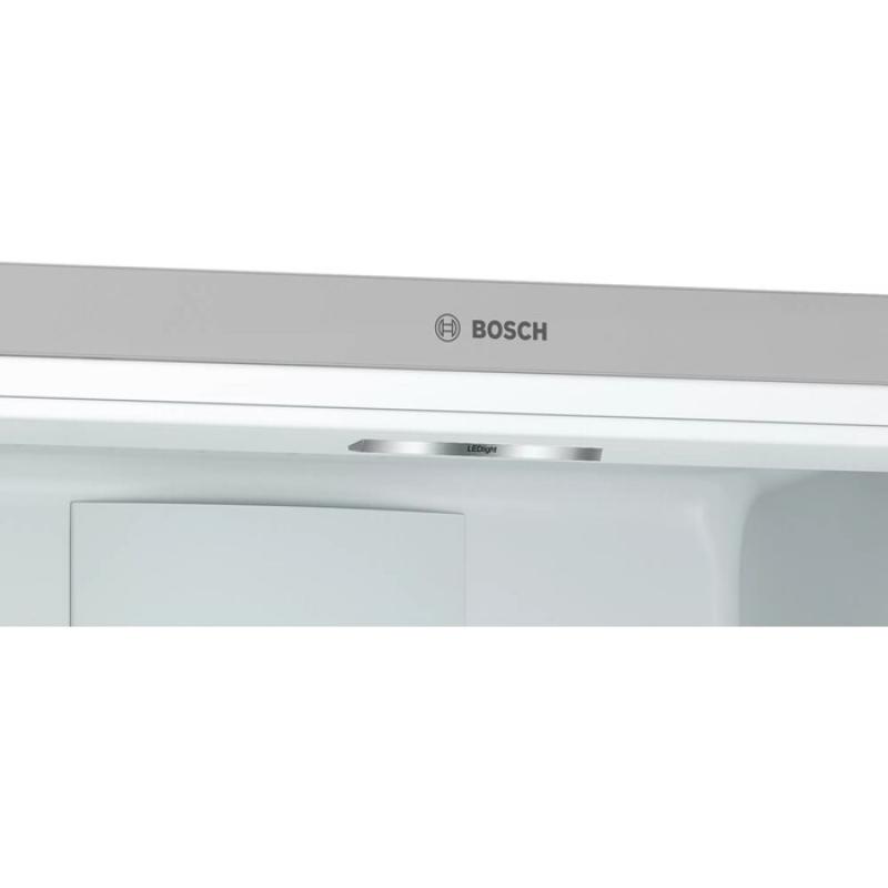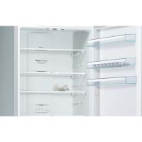 Холодильник BOSCH KGN49XL30U с нижним расположением морозильной камеры имеет общий объем 466 литров. Оснащен электронным управлением и внешним дисплеем. В холодильном отделении объемом 338 литров находятся 4 стеклянные полки и 2 ящика, есть зона свежести VitaFresh 0°C. Морозильная камера объемом 128 литров содержит 3 ящика и систему No Frost. Предусмотрены функции суперзаморозки и суперохлаждения, система многопоточного охлаждения. Класс энергопотребления A++, годовое потребление электроэнергии 303 кВт*ч. Компрессор один, стандартный. Есть оповещение о неисправности и незакрытой двери. Двери металлические с 4 полками, перевешиваются. Размеры 70х203х67 см, вес 85.8 кг.