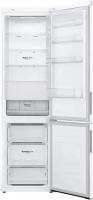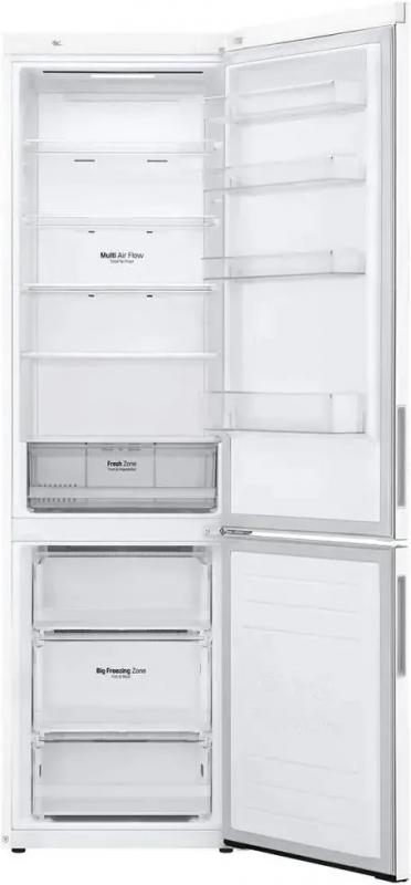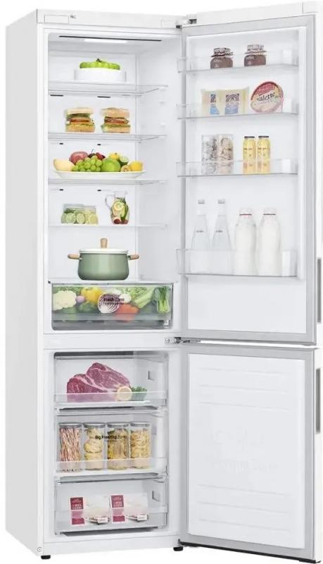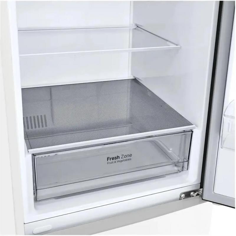 Холодильник LG GA-B509CQWL двухкамерный с нижним расположением морозильной камеры. Общий объем 419 л, полезный 384 л. Холодильное отделение содержит 292 л общего и 277 л полезного объема с пятью стеклянными полками и одним ящиком. Морозильная камера включает 127 л общего и 107 л полезного объема с тремя ящиками. Система размораживания Total No Frost. Электронное управление с внешним дисплеем. Температурный диапазон холодильной камеры от 1°C до 7°C, морозильной от -15°C до -23°C. Инверторный компрессор с хладагентом R600a. Функции суперзаморозки Express Freeze и суперохлаждения. Защита от детей и система многопоточного охлаждения DoorCooling+. Антибактериальное покрытие Bio Shield и технология зоны свежести Fresh Zone. Класс энергопотребления A+ с годовым потреблением 325 кВт*ч. Уровень шума 36 дБ. Двери нержавеющей стали с матовой поверхностью белого цвета. Габариты 59.5х203х68.2 см, вес 74 кг.